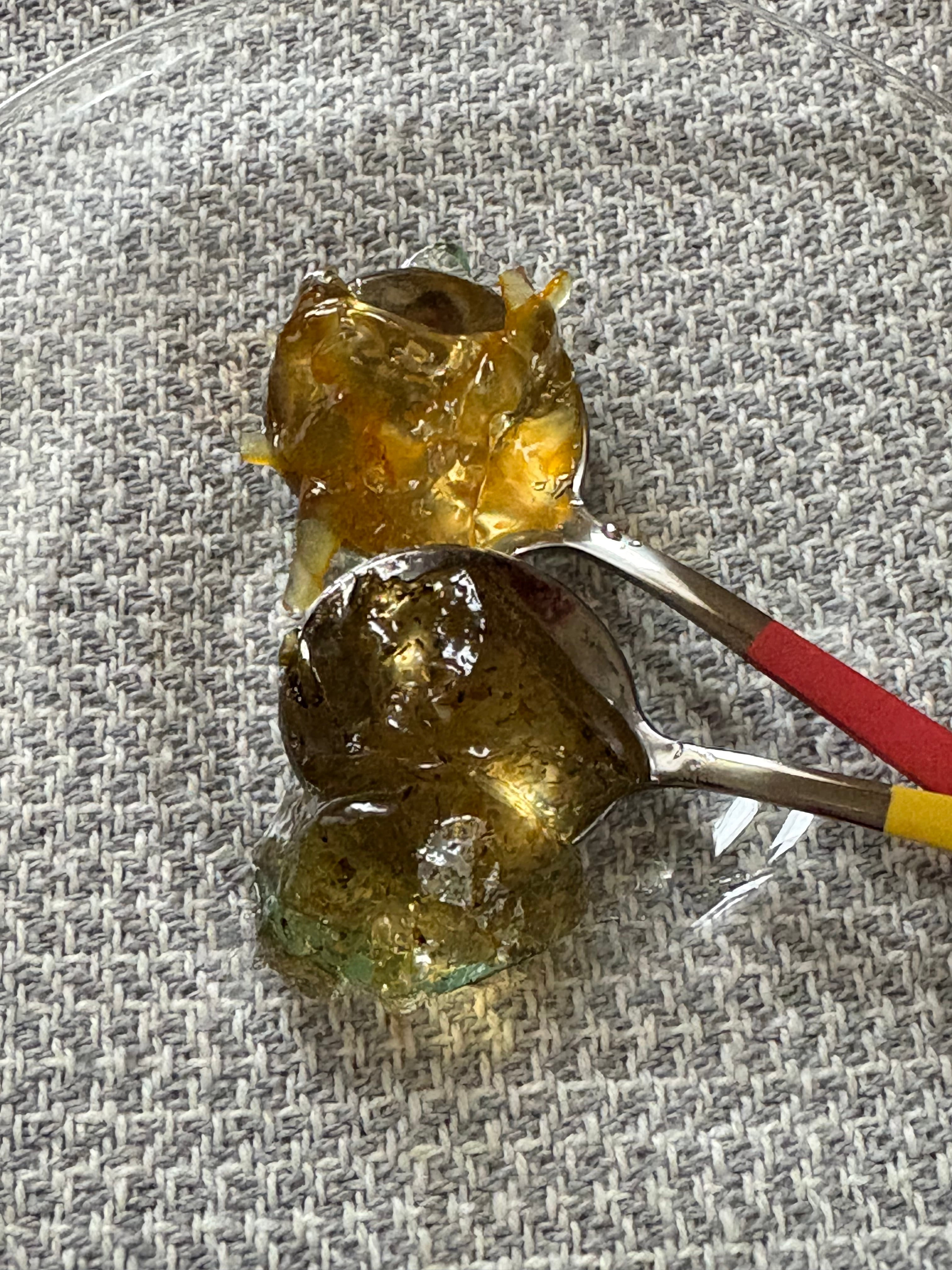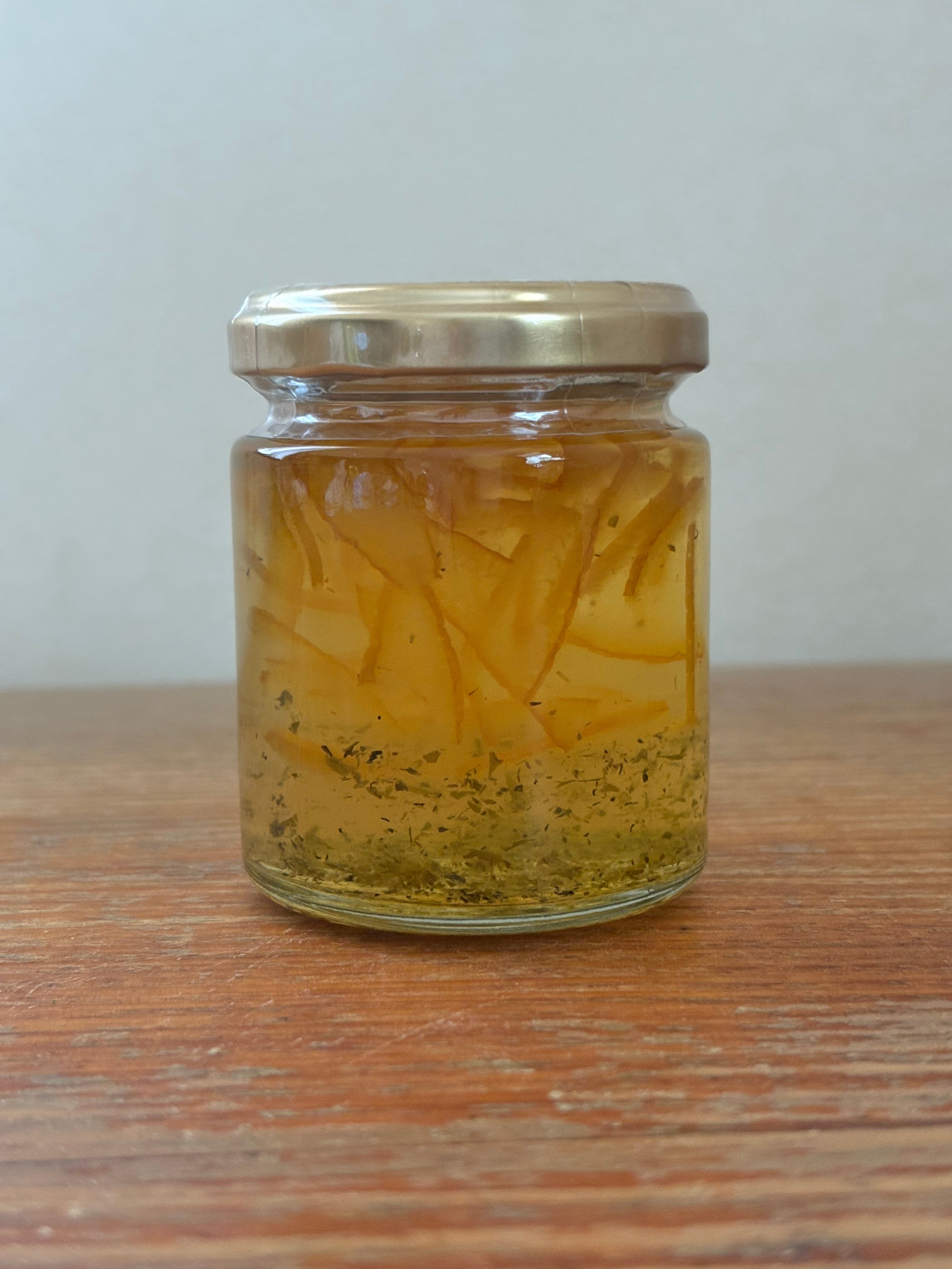 下層にハーブ入り柚子ジェリー、上層に柚子マーマレードの二層になっています。ジェリー部分にはレモンバーベナ、カモミール、ミントのハーブを使用しています。